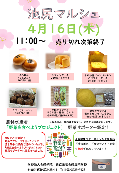3/19㈭11時より本校正門前にて本校管理栄養士科4年生が考案・製造したお弁当、焼き菓子を販売します。 定番商品のカヌレ・シフォンケーキもご用意します。 世田谷みやげに認定されました、世田谷産ジャンボレモンのパウンドケー […]